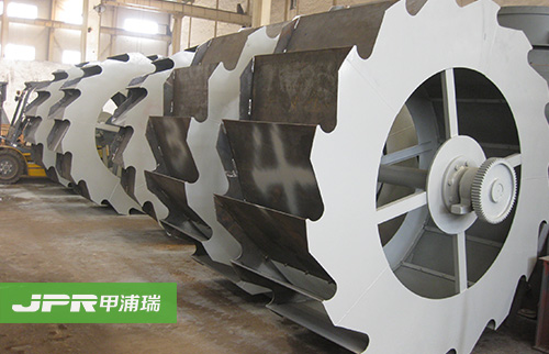 工作时,电机通过三角带、减速机、齿轮减速后带动叶轮缓慢转动,砂石有给料槽进入洗槽中,在叶轮的带动下翻滚,并互相研磨,除去覆盖砂石表面的杂质, 同时破坏包覆砂粒的水汽层,以利于脱水;同时加水,形成强大水流,及时将杂质及比重小的异物带走,并从溢出口洗槽排出,完成清洗作用。干净的砂石由叶片带 走,后砂石从旋转的叶轮倒入出料槽,完成砂石的清洗作用。